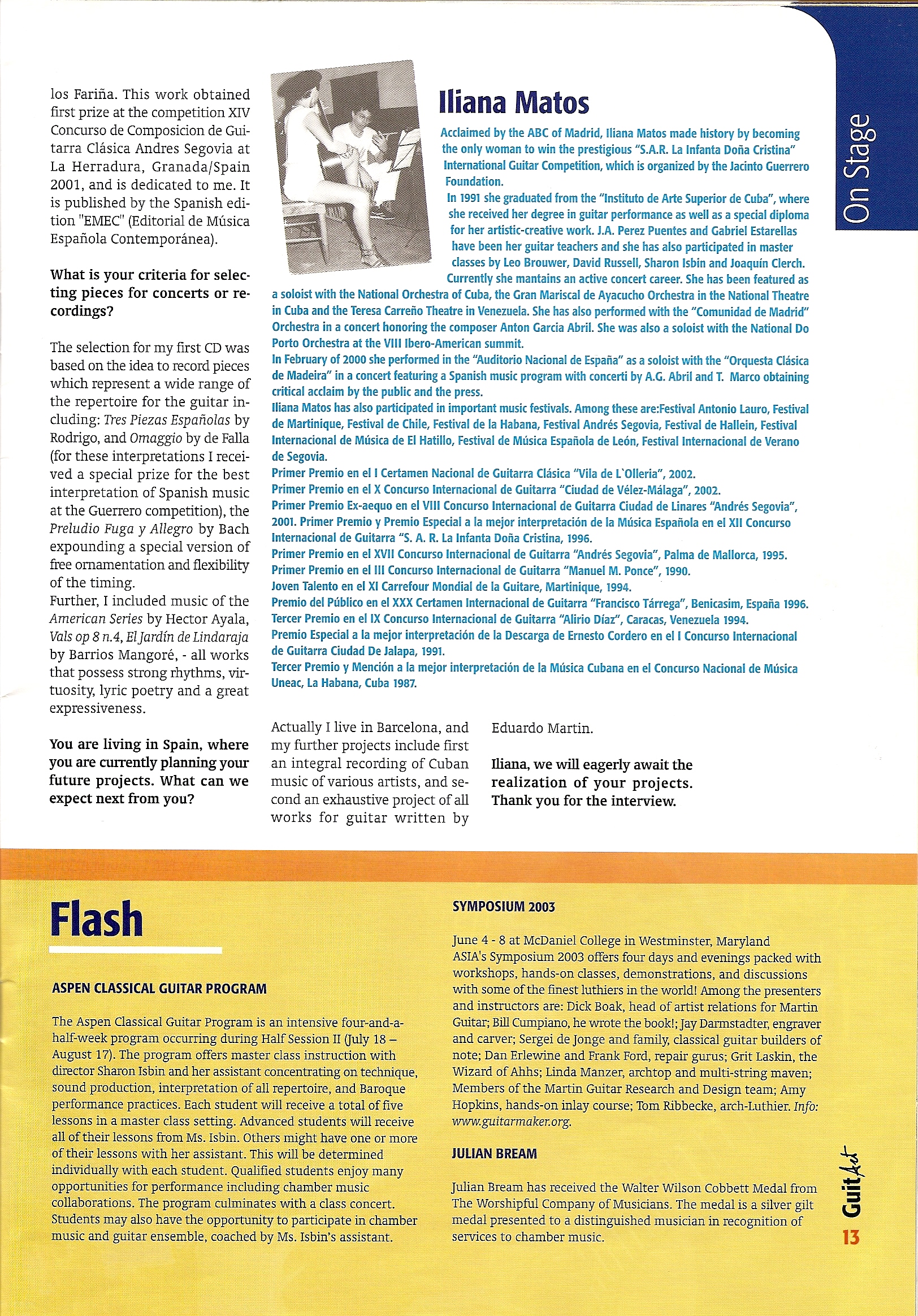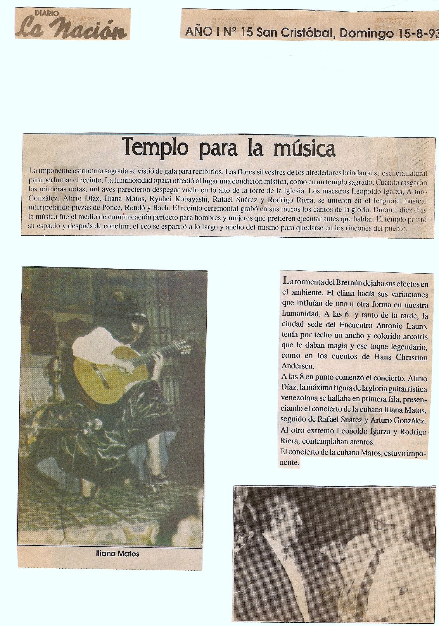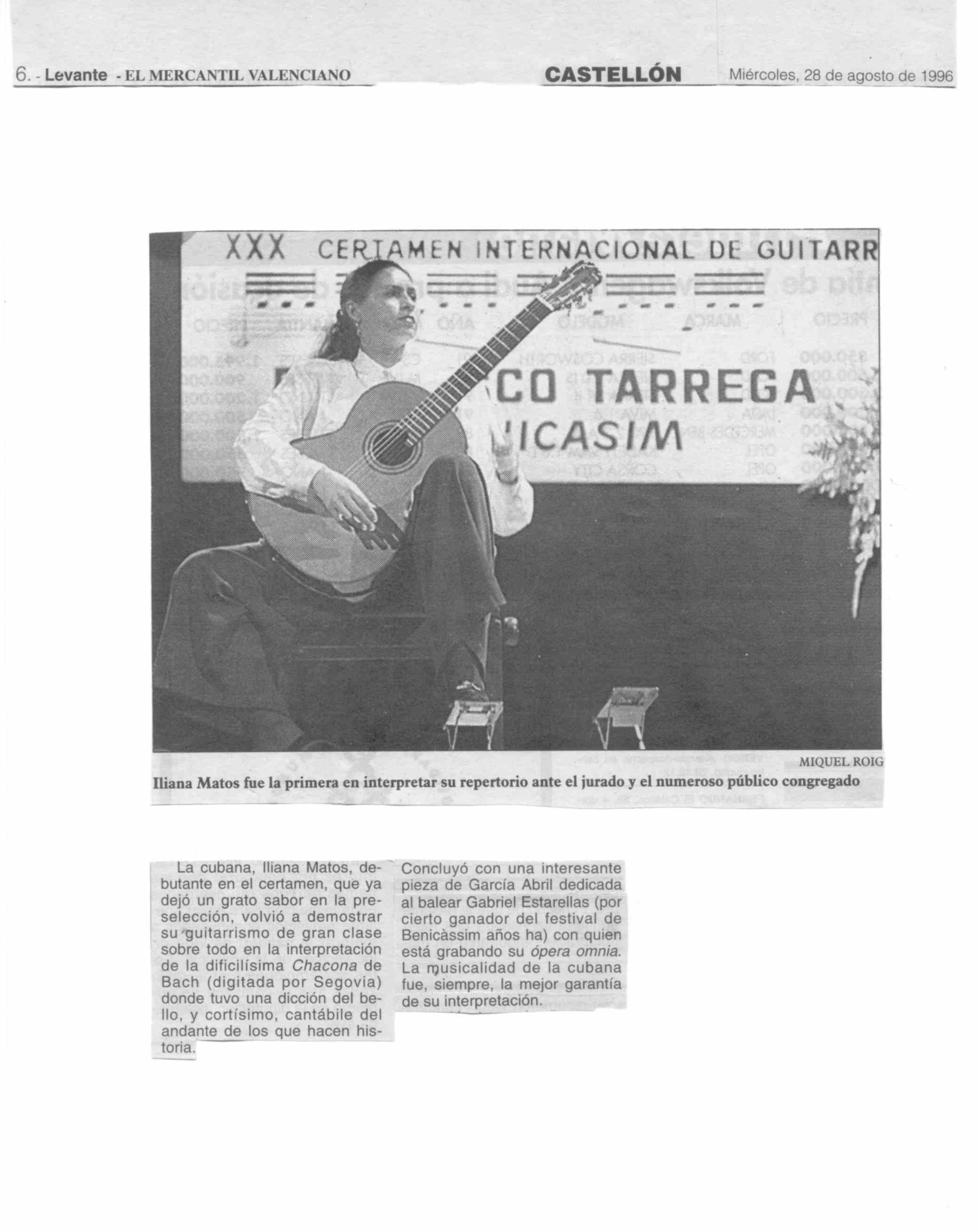 With her love of contemporary music and desire to develop the guitar repertoire, Iliana Matos has premiered works by numerous composers, including Eduardo Morales, Tomás Marco, Zulema de la Cruz, Gabriel Estarellas, Flores Chaviano, Ileana Pérez, Madays Andino, Ñico Rojas, Yalil Guerra, Luis Mario Ochoa and Eduardo Martín.