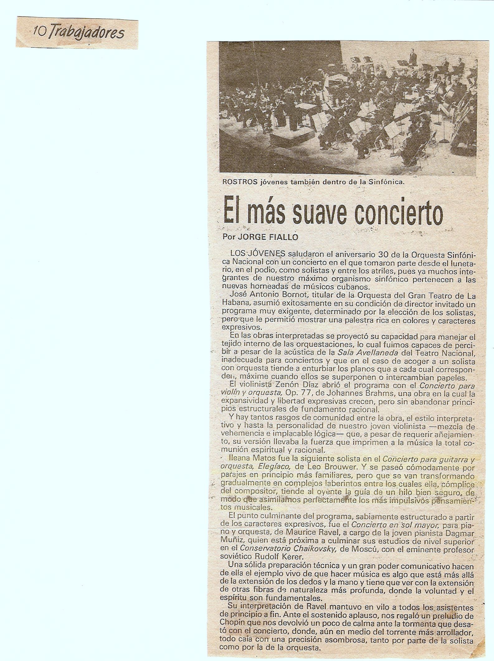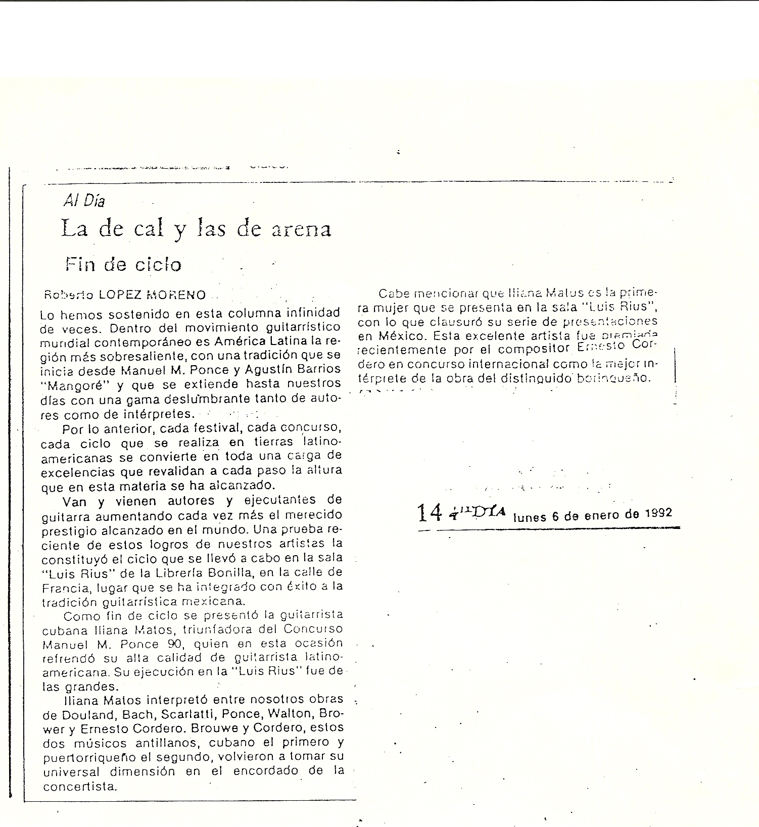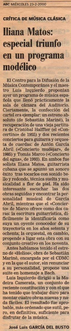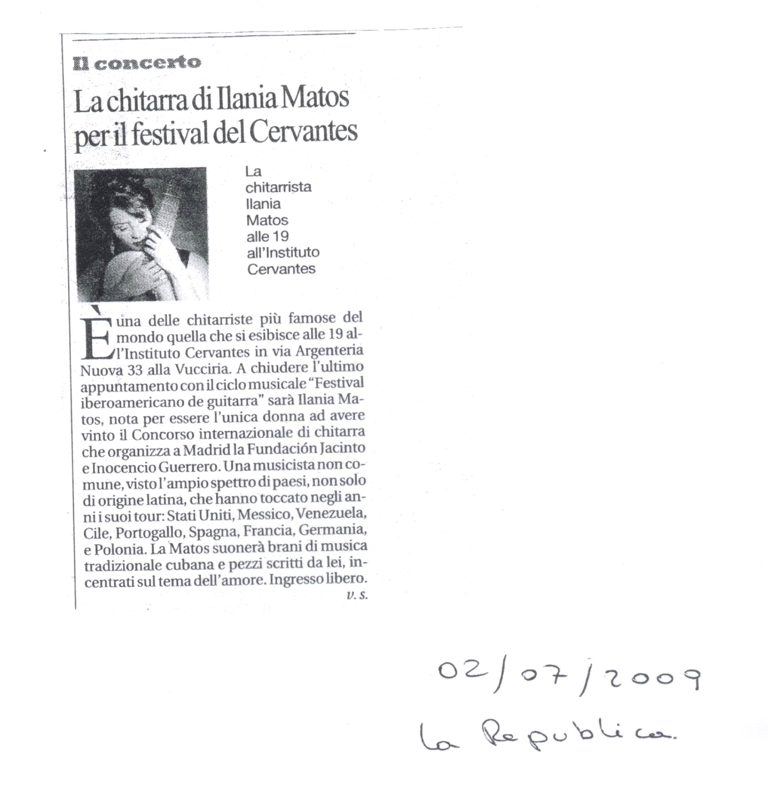 With her love of contemporary music and desire to develop the guitar repertoire, Iliana Matos has premiered works by numerous composers, including Eduardo Morales, Tomás Marco, Zulema de la Cruz, Gabriel Estarellas, Flores Chaviano, Ileana Pérez, Madays Andino, Ñico Rojas, Yalil Guerra, Luis Mario Ochoa and Eduardo Martín.