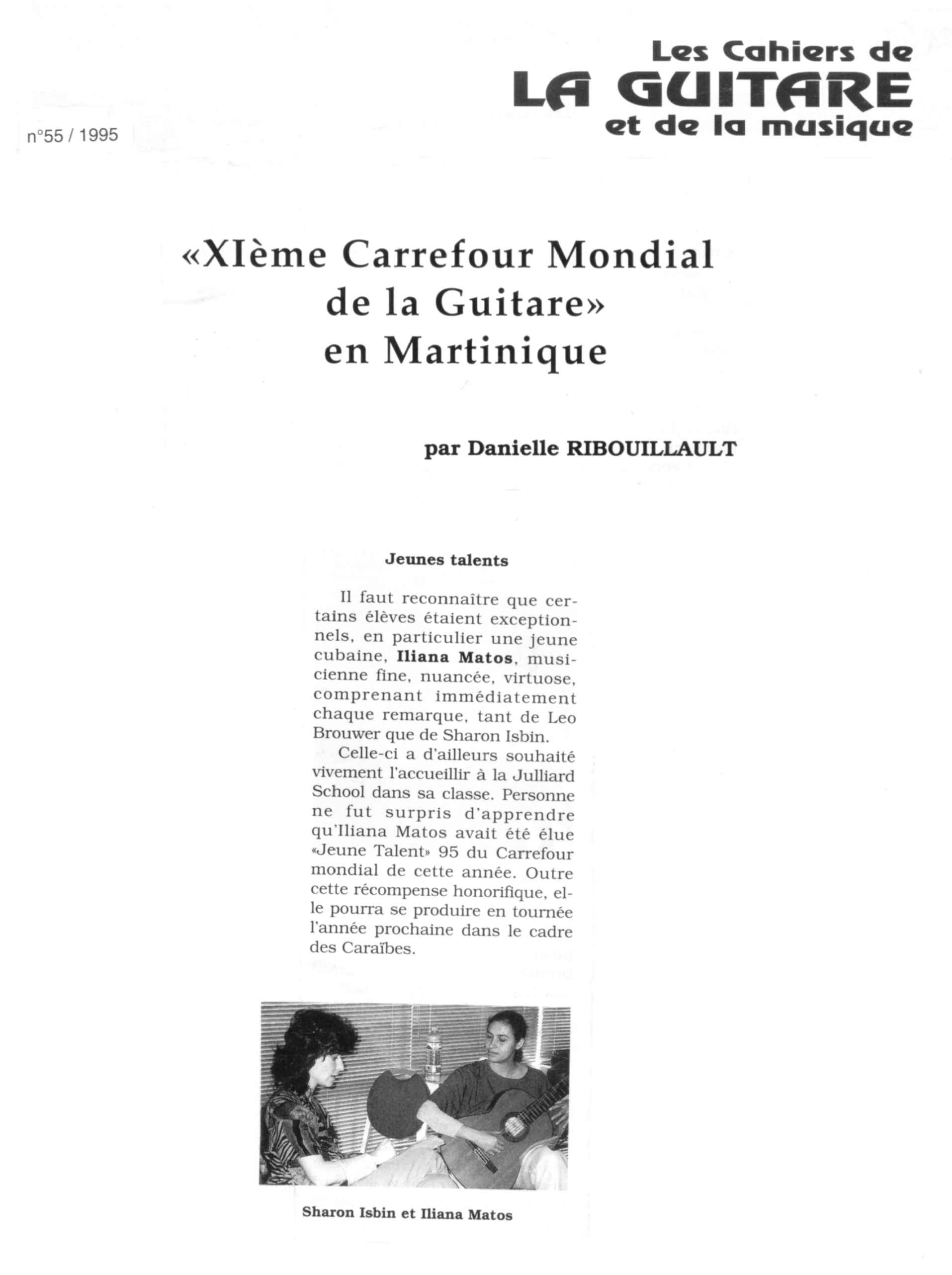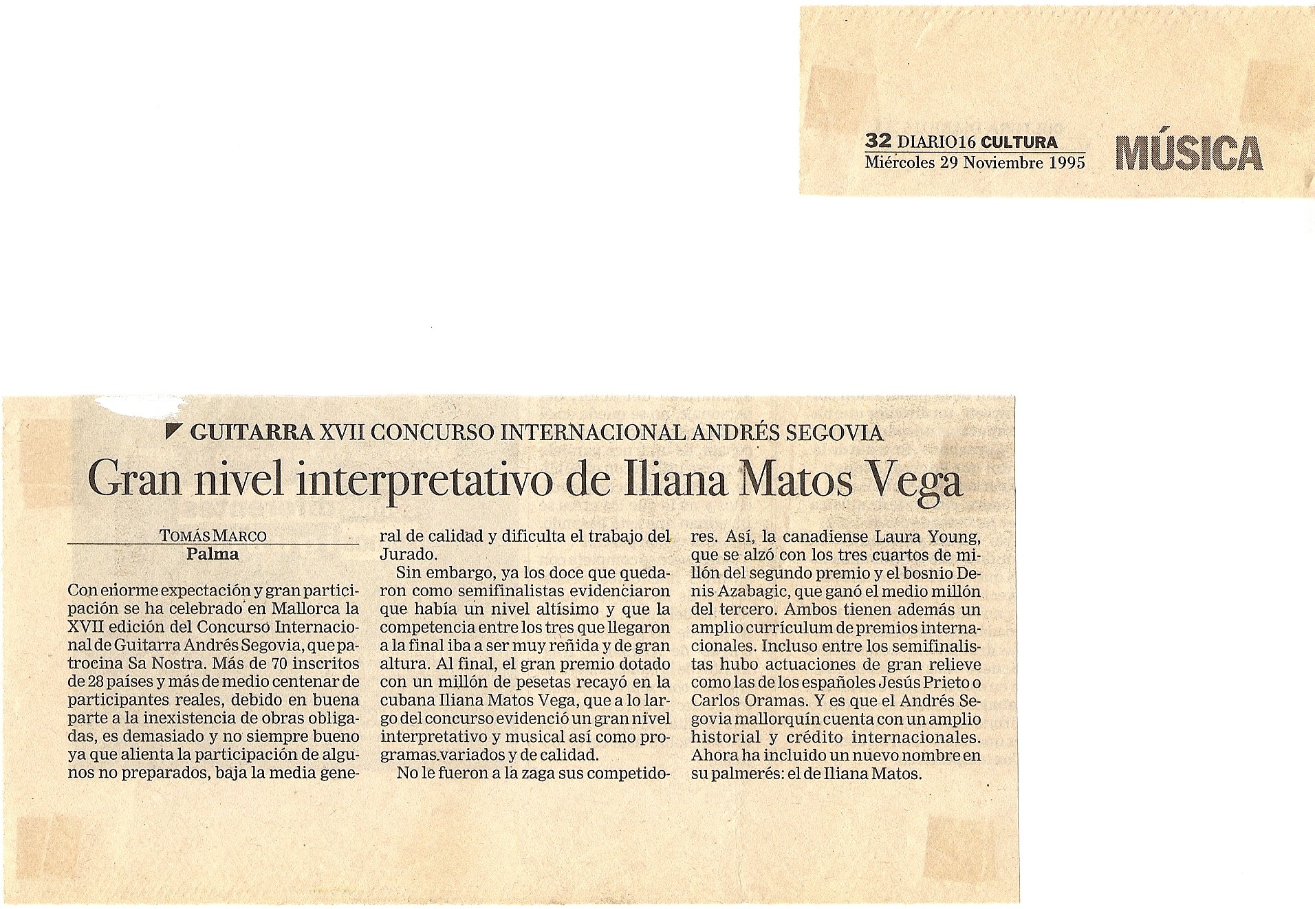 Matos made history as the first woman to win the prestigious S.A.R. La Infanta Doña Cristina International Guitar Competition, and as the only person to win the special prize for Best Interpretation of Spanish Music in two consecutive years, 1995 and 1996. She was a prize-winner at eleven major international competitions, including first prizes at the Andrés Segovia, Luys Milán, and Manuel Ponce international guitar competitions. Of her talent, the legendary guitarist Maria Luisa Anido said: I am impressed by your wonderful guitarristic art, and I am proud to know that a woman (and a Cuban woman!) came to such a degree of artistic perfection.”
